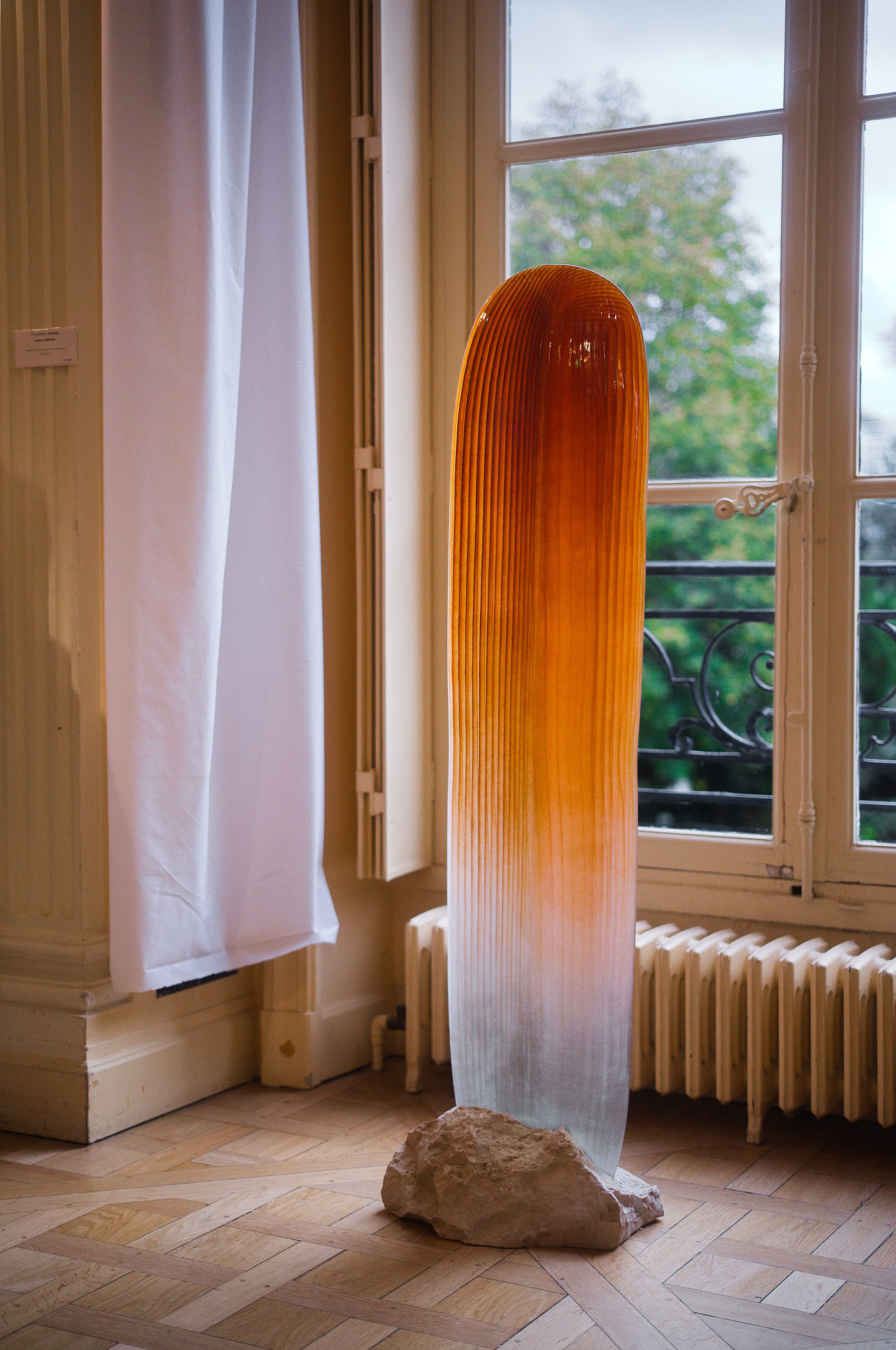 Chaque oeuvre de Jonathan Ausseresse est un bloc raisonné de claire énergie, fluide, dense et toujours en élévation. Bloc monolithique d’éternelle histoire, parfois proche d’une pièce voisine, en partage d’humanité. De la force brute initiale, terre archaïque privée de lumière, surgit la sublime plénitude d’une oeuvre habitée. « J’explore la matière » m’a dit l’artiste, et l’élévation est son territoire. Les sculptures de verre de Jonathan Ausseresse éblouissent l’étendue.