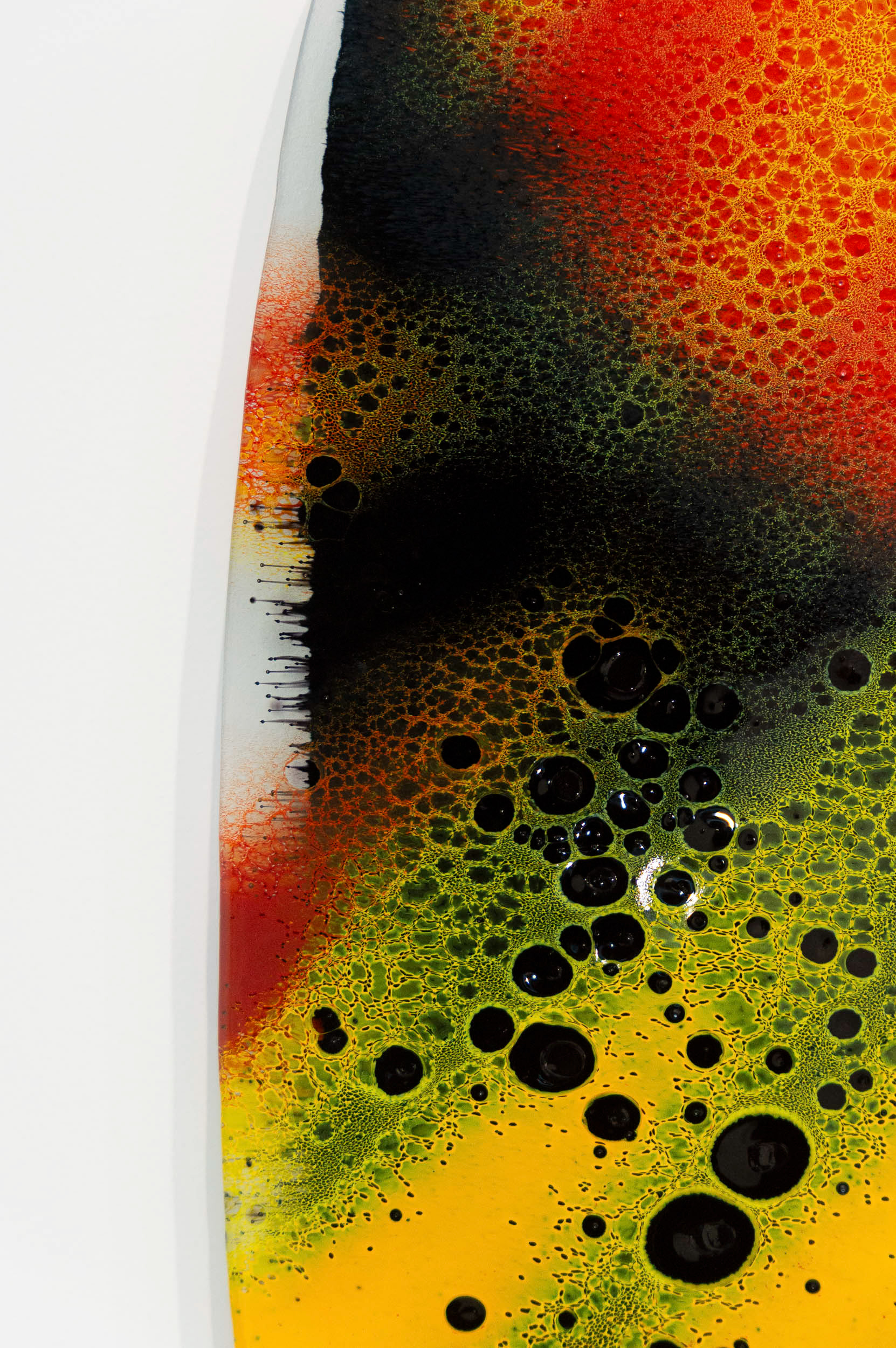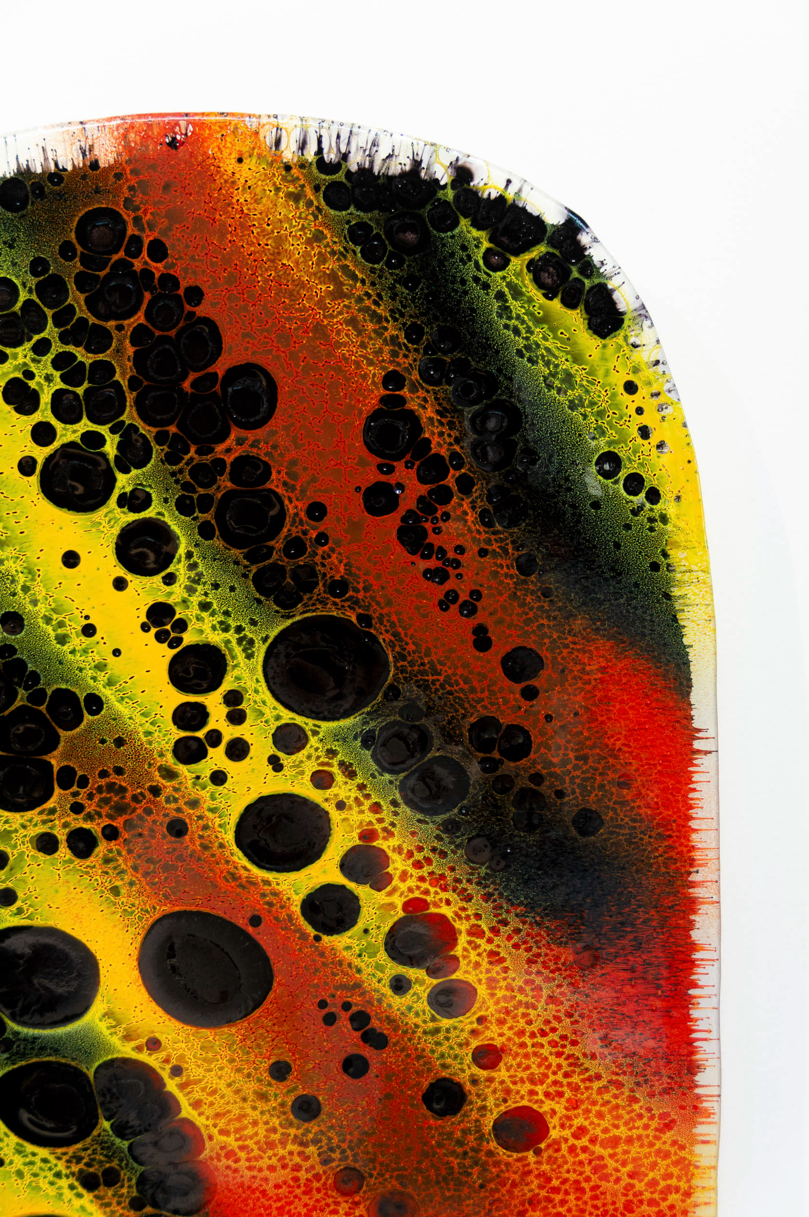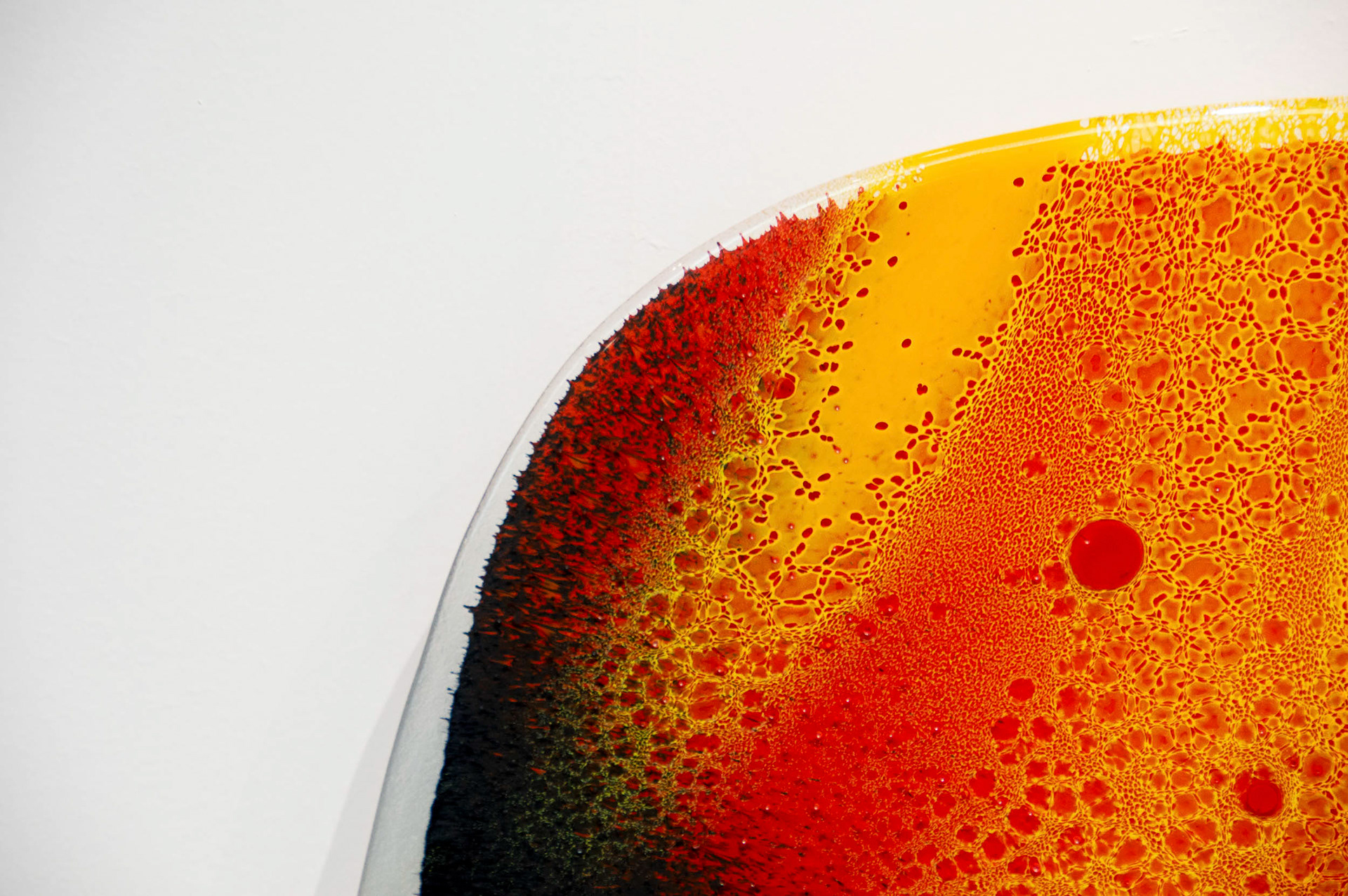 Fervere, qui vient du latin “faire bouillir”, reflète cette intention de révéler ce qui se joue entre les couches de verre et d’émail : migrations, diffusion de couleurs, densités qui se croisent et s’interpénètrent. Cette exploration technique me permet de créer un langage graphique singulier fait de contrastes, de micro-détails et de nuances fondues. Les dégradés servent d’ailleurs de terrain d’expérimentation : ils témoignent du spectre des possibles à travers les variations d’épaisseurs entre émail et verre.