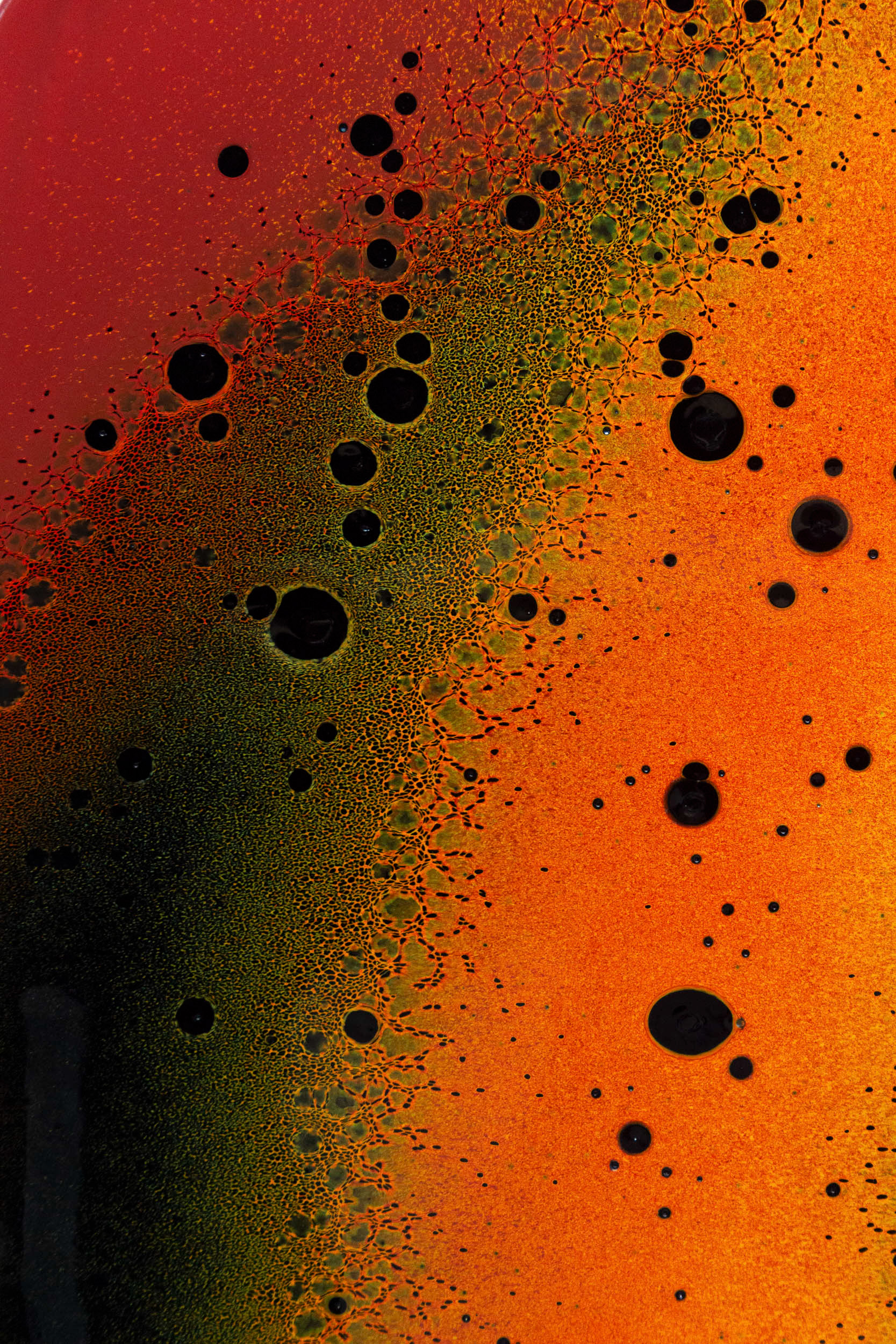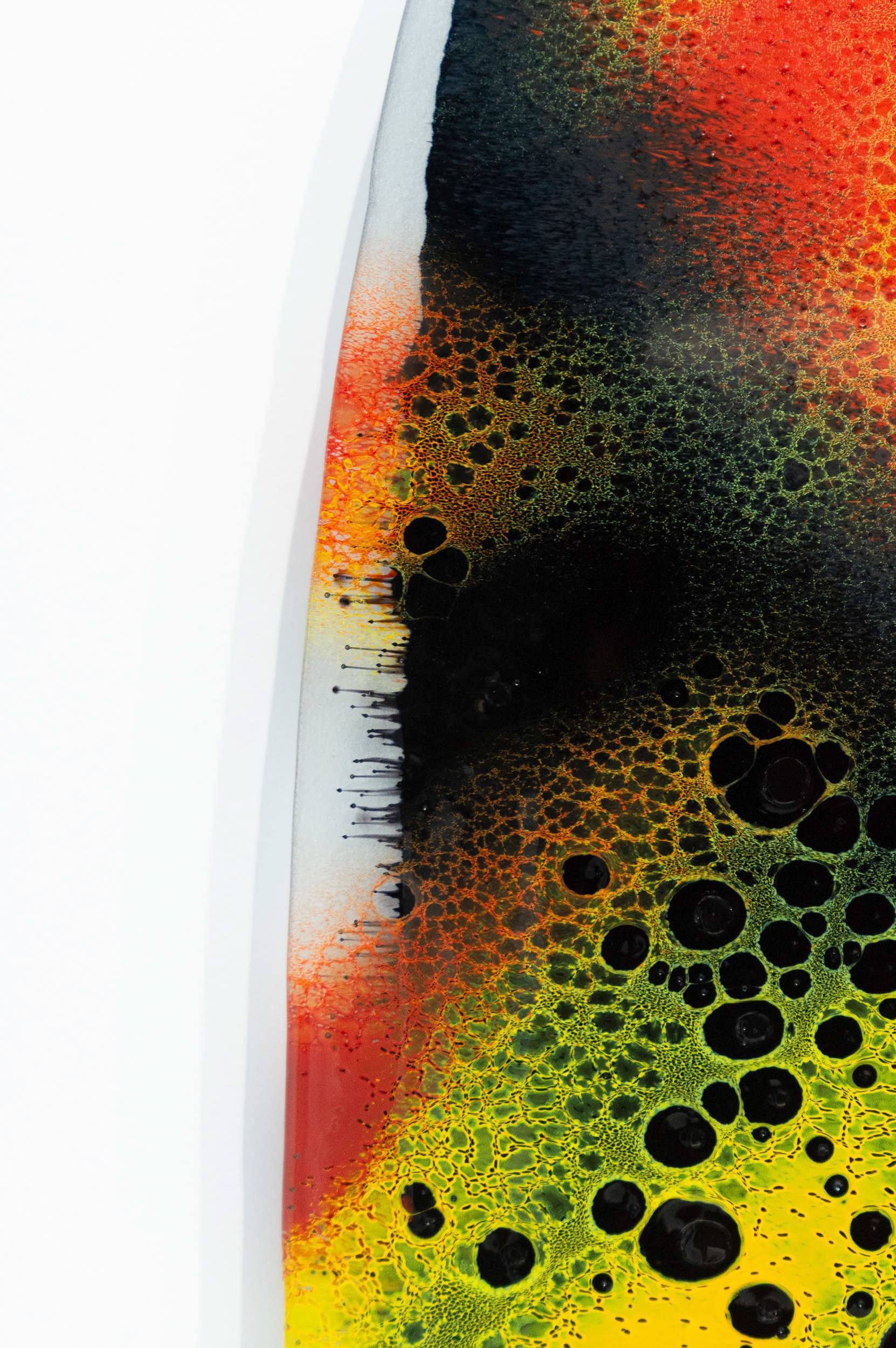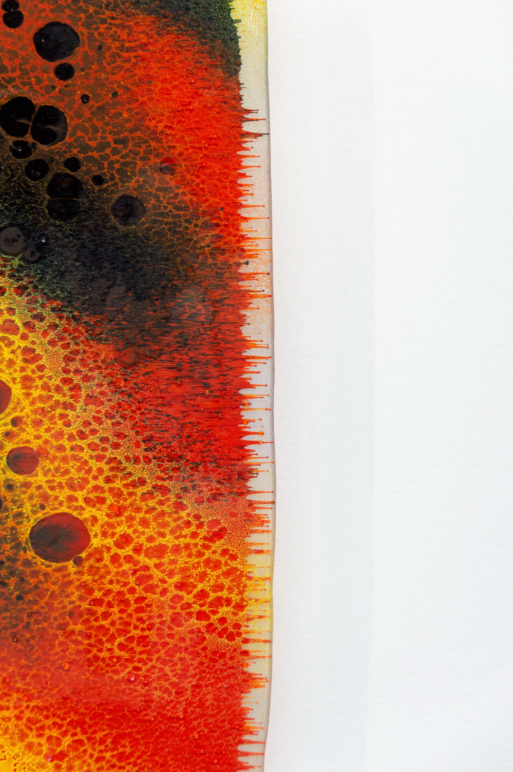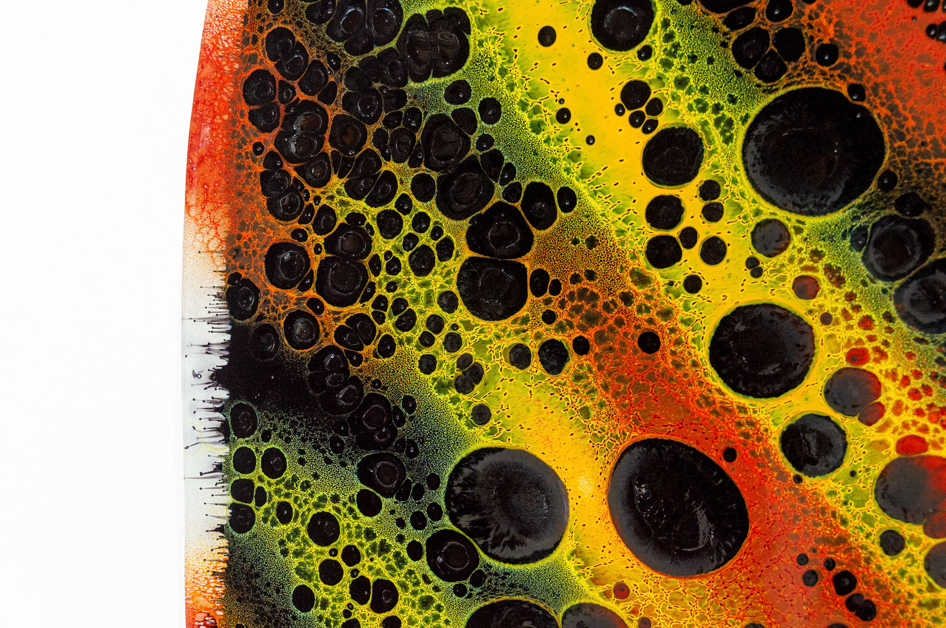 Fervere, qui vient du latin “faire bouillir”, reflète cette intention de révéler ce qui se joue entre les couches de verre et d’émail : migrations, diffusion de couleurs, densités qui se croisent et s’interpénètrent. Cette exploration technique me permet de créer un langage graphique singulier fait de contrastes, de micro-détails et de nuances fondues. Les dégradés servent d’ailleurs de terrain d’expérimentation : ils témoignent du spectre des possibles à travers les variations d’épaisseurs entre émail et verre.