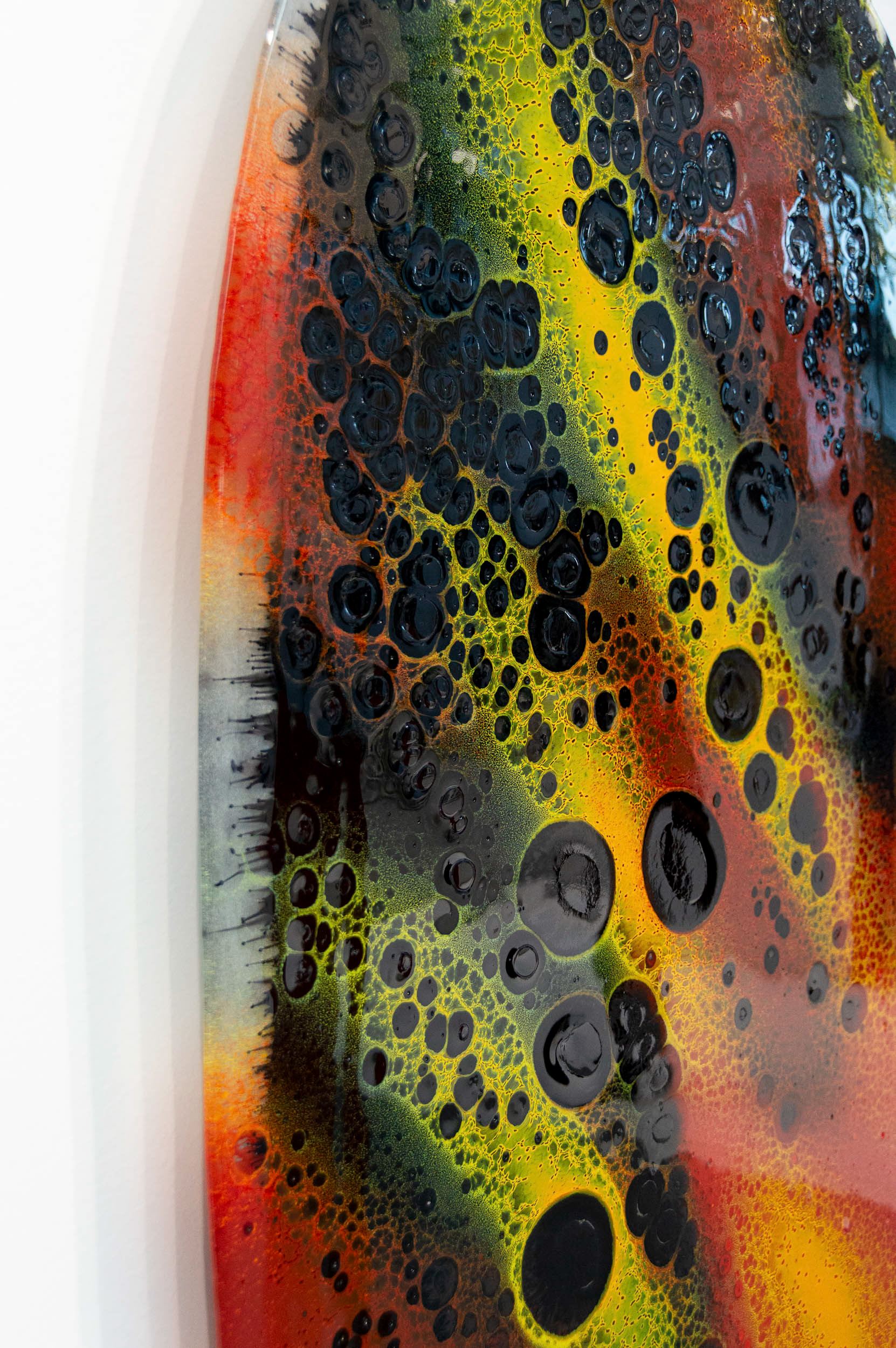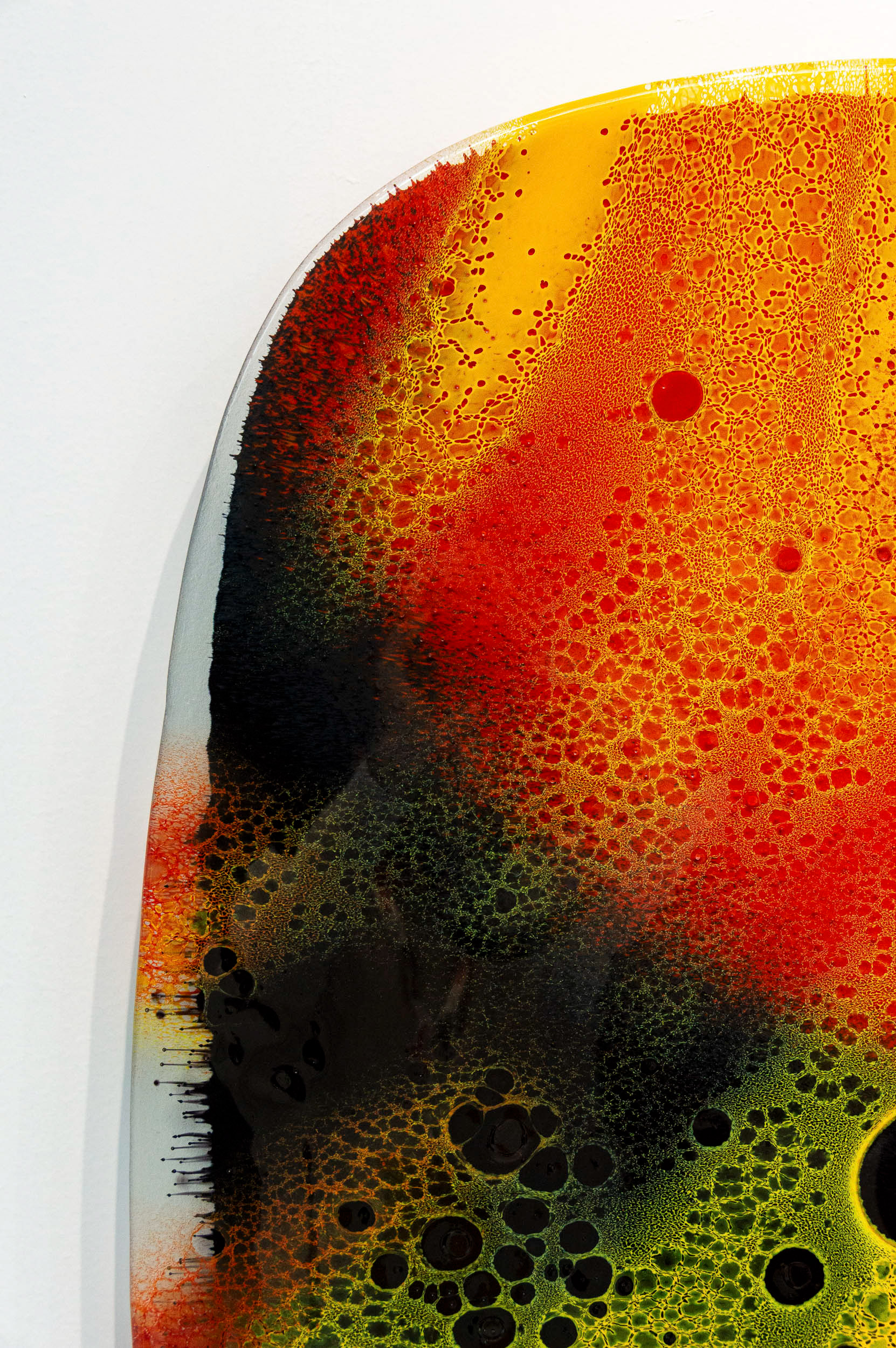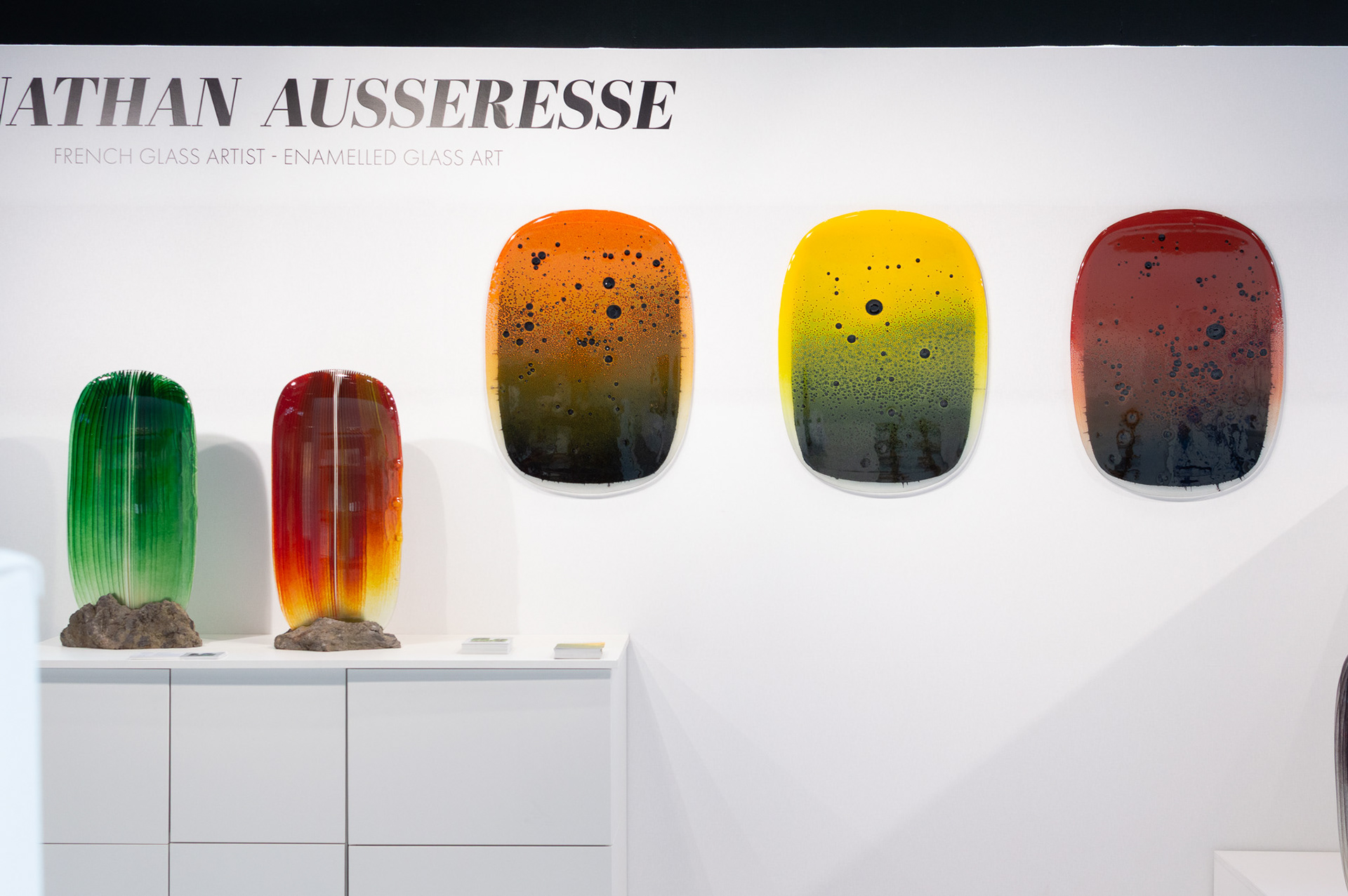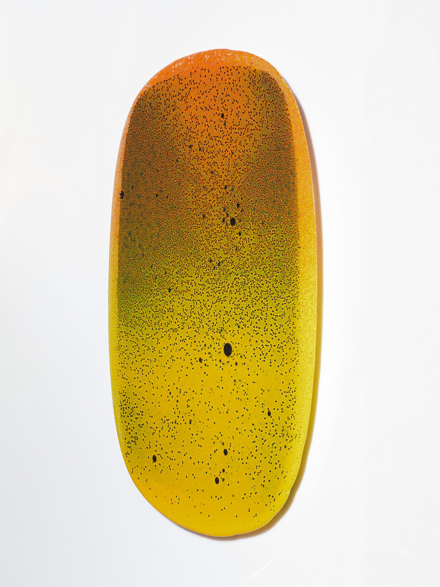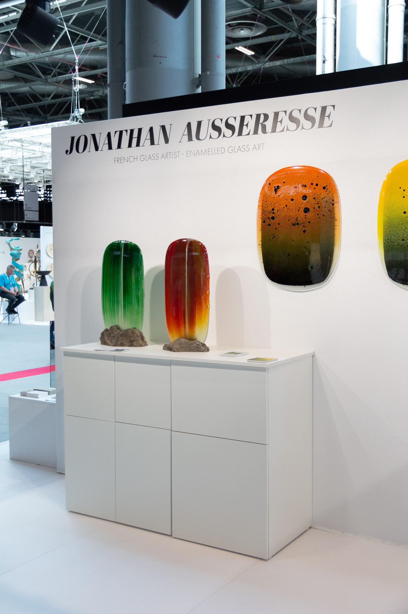 Le choix du format mural, sans socle, libère le verre et lui permet d’exister pleinement comme une œuvre picturale autonome. La matière devient alors surface et profondeur, un champ où la couleur se déploie et se transforme. Ces tableaux explorent la subtilité de l’opacité, l’intensité et la lumière intérieure du verre.