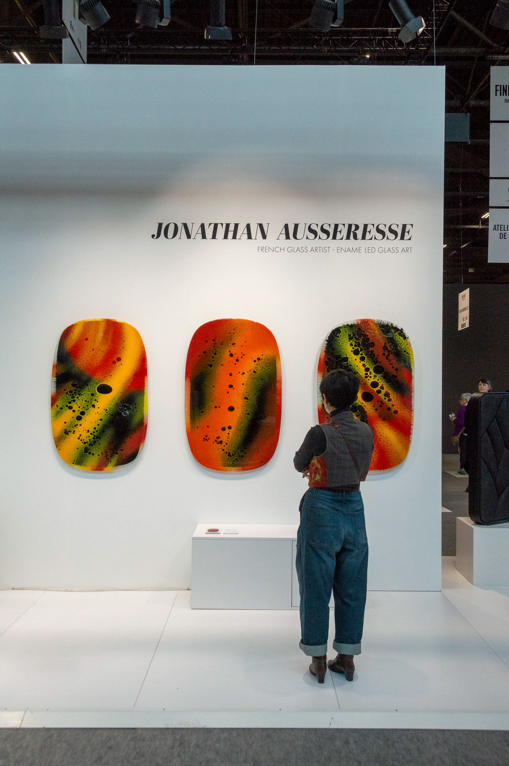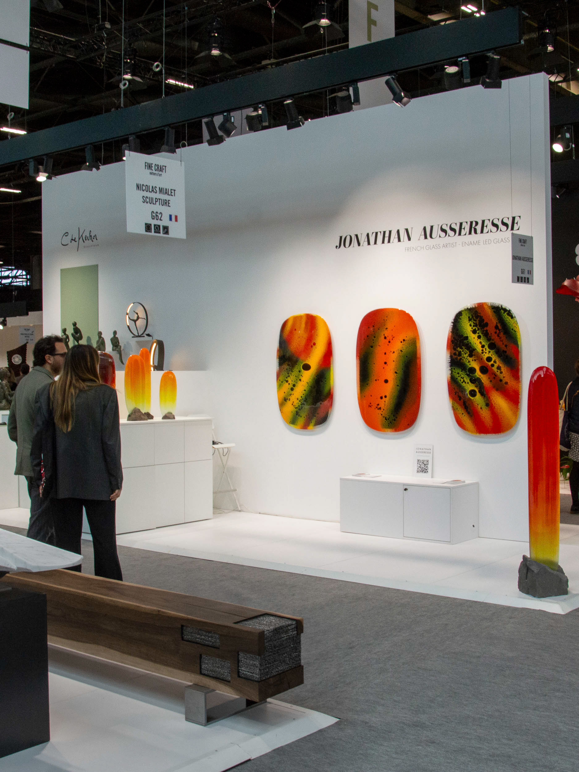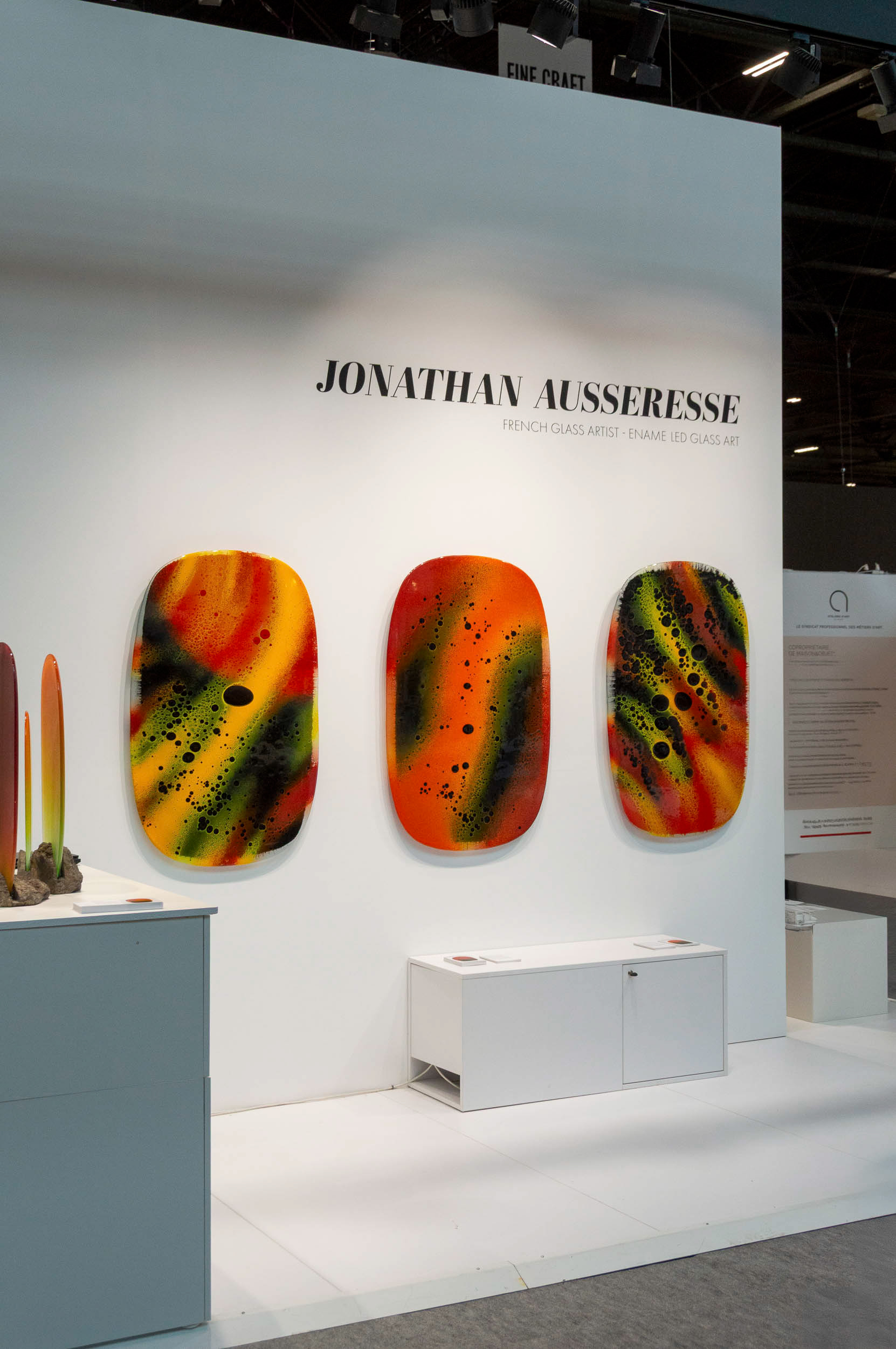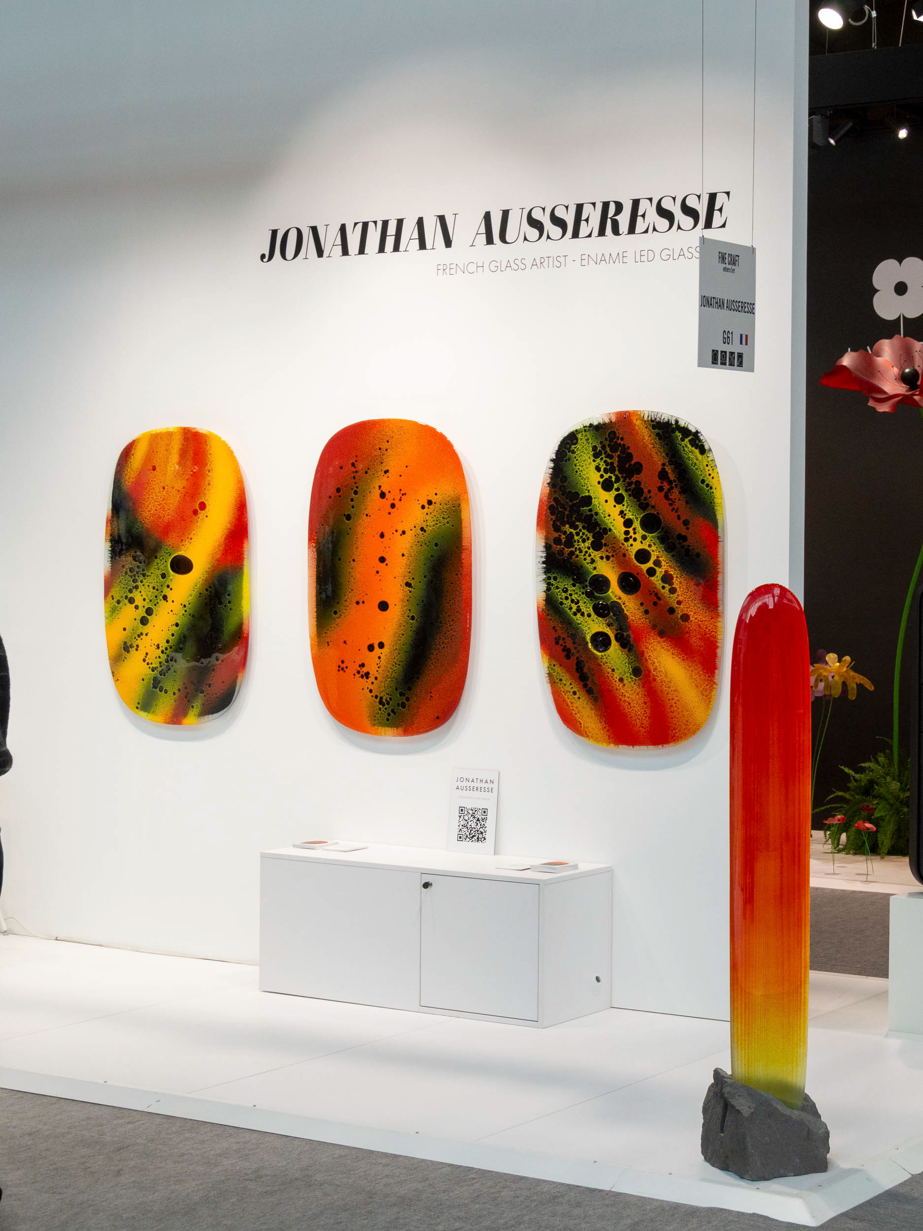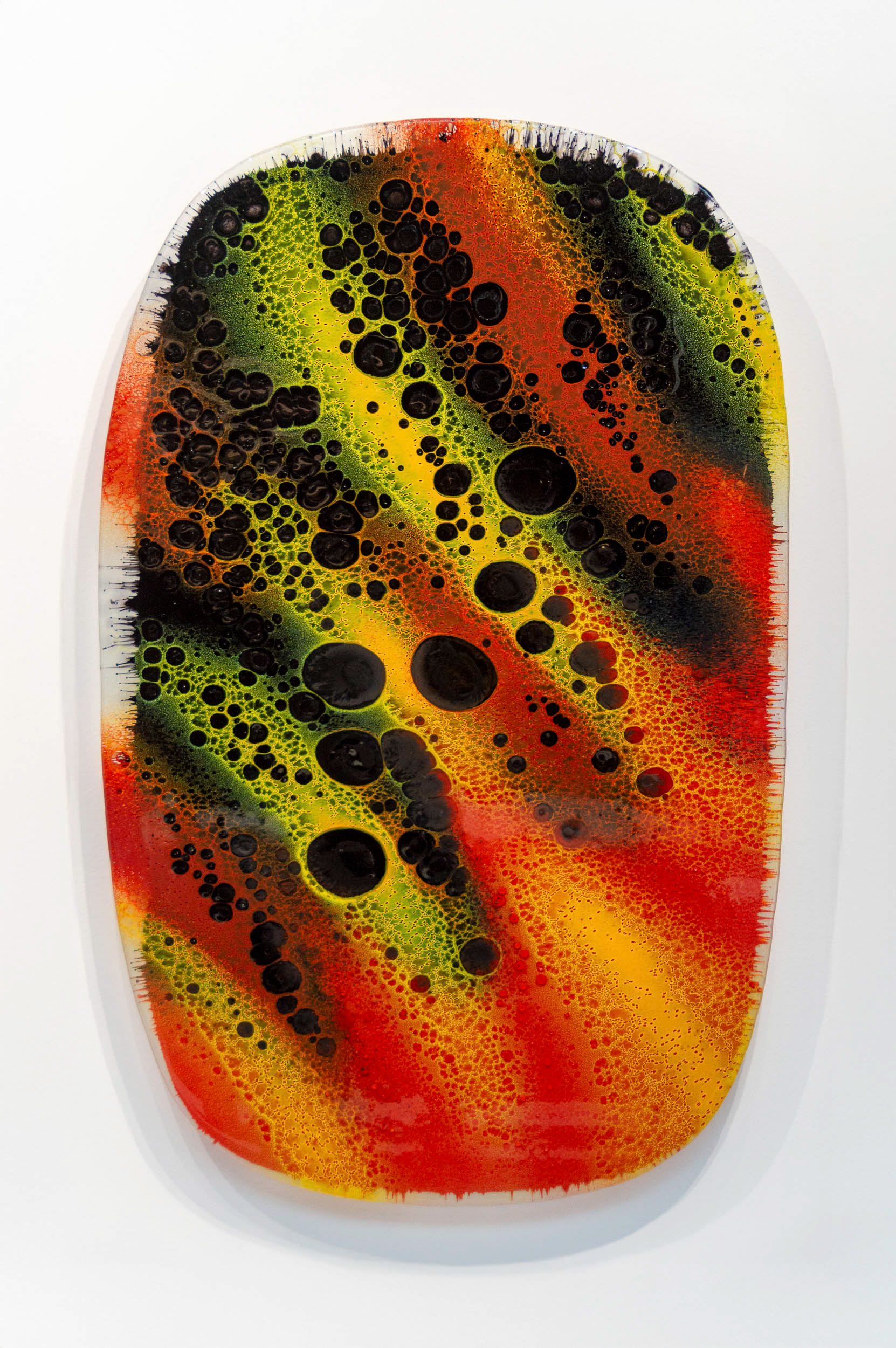 Le choix du format mural, sans socle, libère le verre et lui permet d’exister pleinement comme une œuvre picturale autonome. La matière devient alors surface et profondeur, un champ où la couleur se déploie et se transforme. Ces tableaux explorent la subtilité de l’opacité, l’intensité et la lumière intérieure du verre.