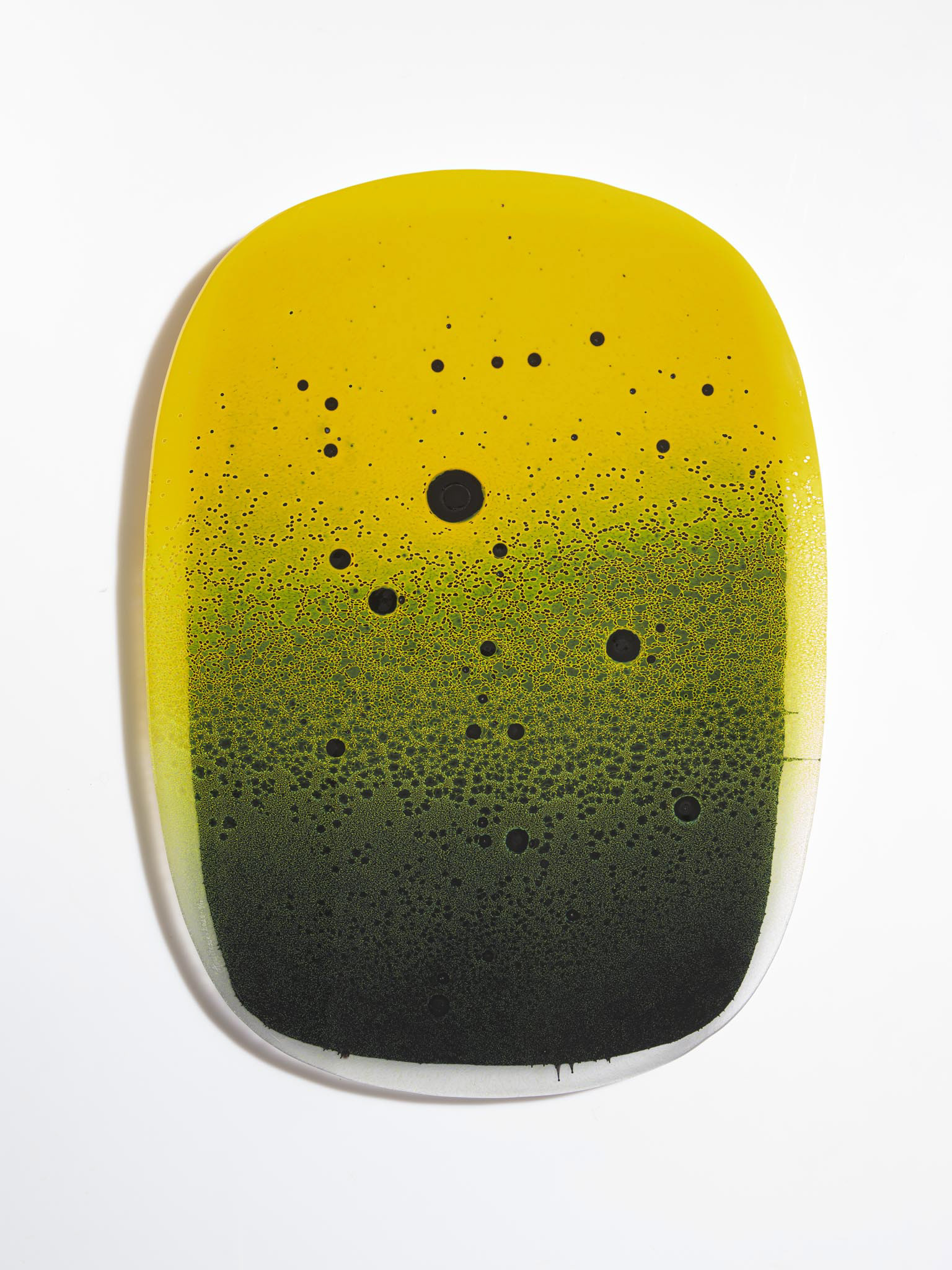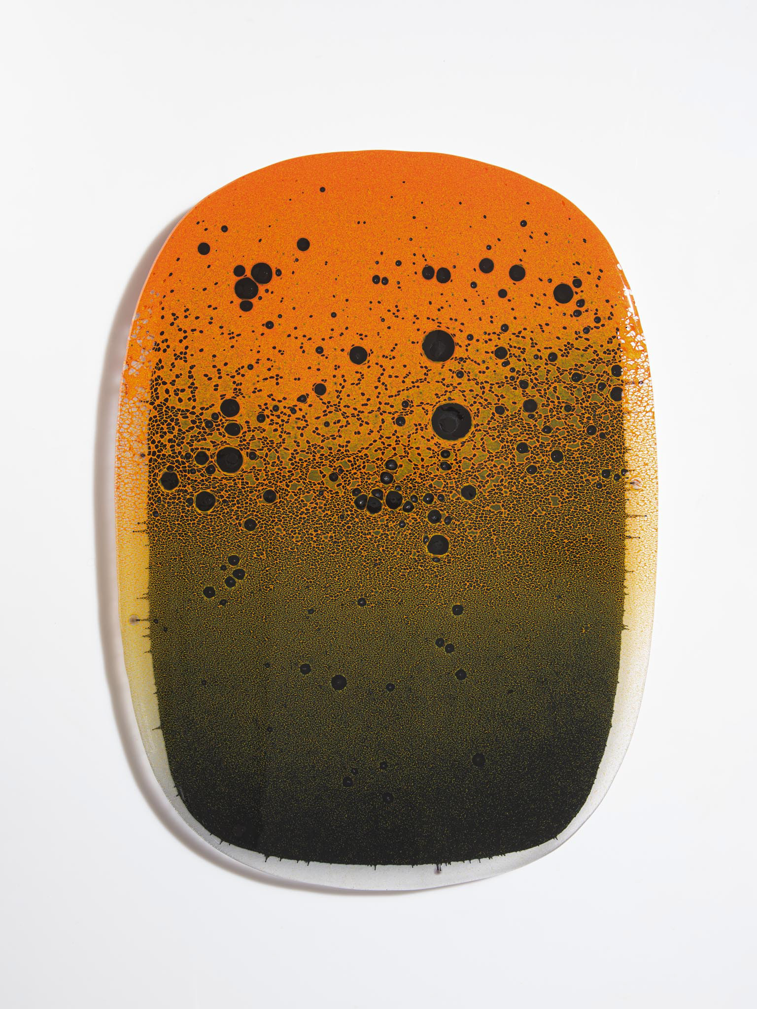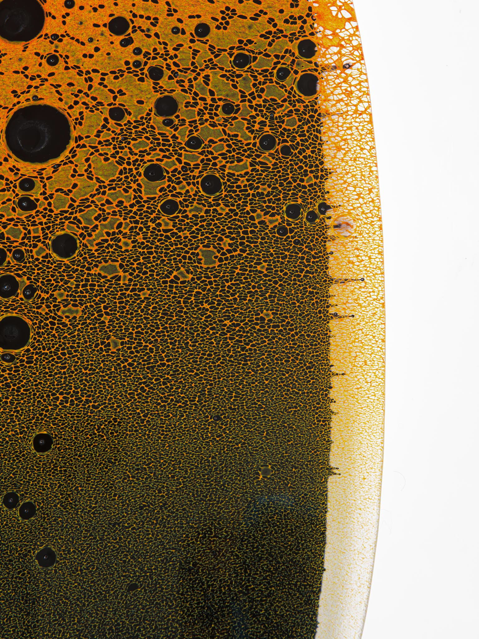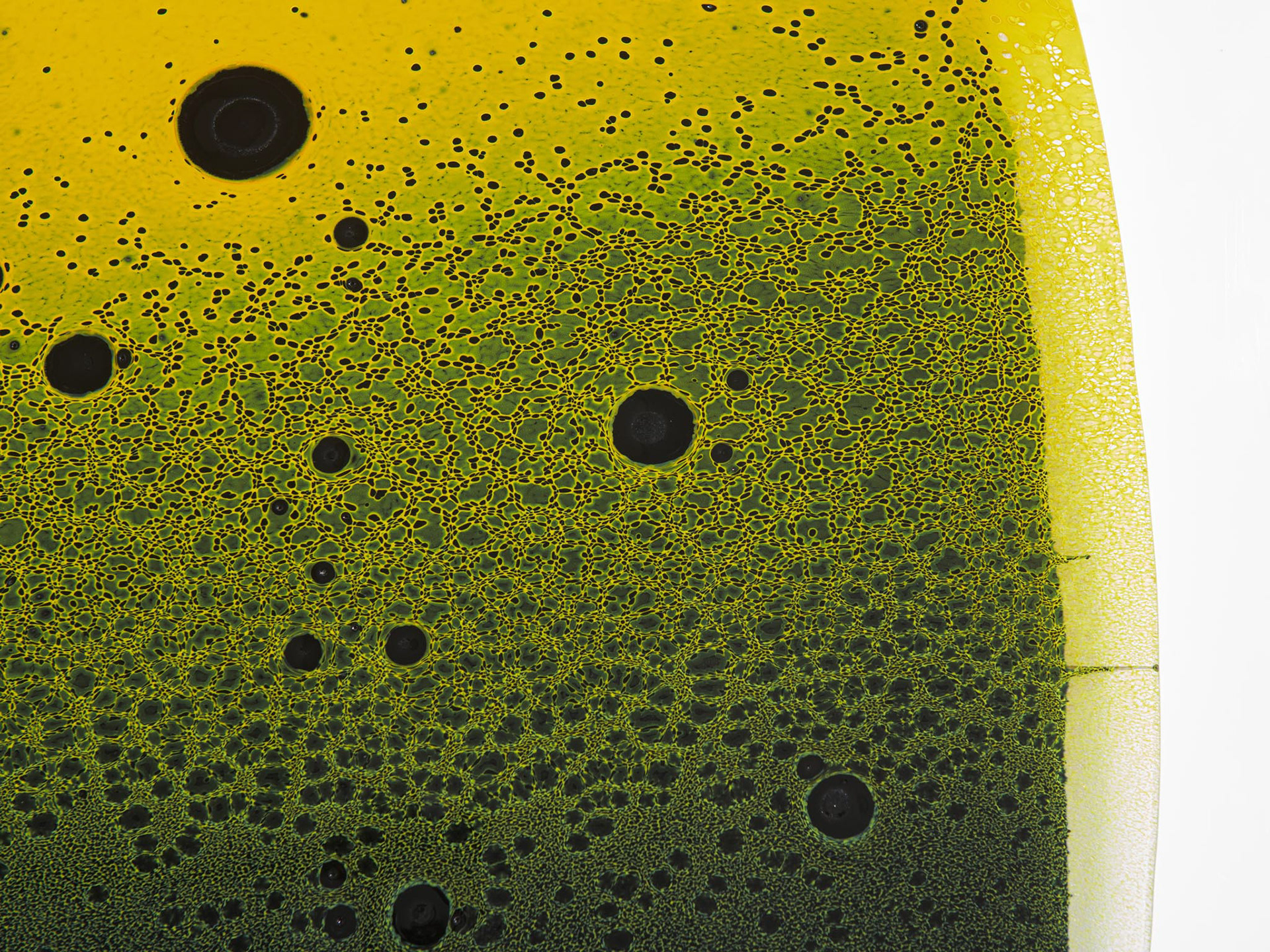 Fervere, qui vient du latin “faire bouillir”, reflète cette intention de révéler ce qui se joue entre les couches de verre et d’émail : migrations, diffusion de couleurs, densités qui se croisent et s’interpénètrent. Cette exploration technique me  permet de créer un langage graphique singulier fait de contrastes, de micro-détails et de nuances fondues. Les dégradés servent d’ailleurs de terrain d’expérimentation : ils témoignent du spectre des possibles à travers les variations d’épaisseurs entre émail et verre.