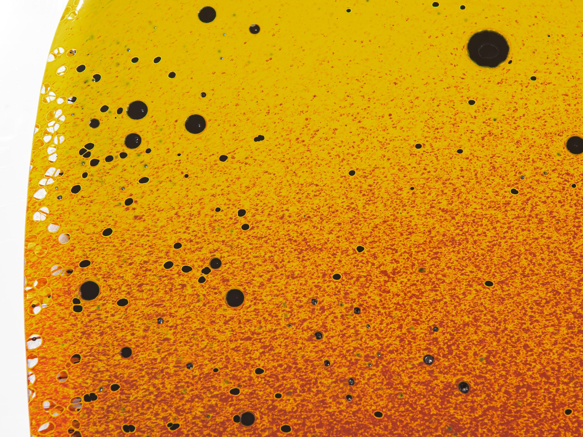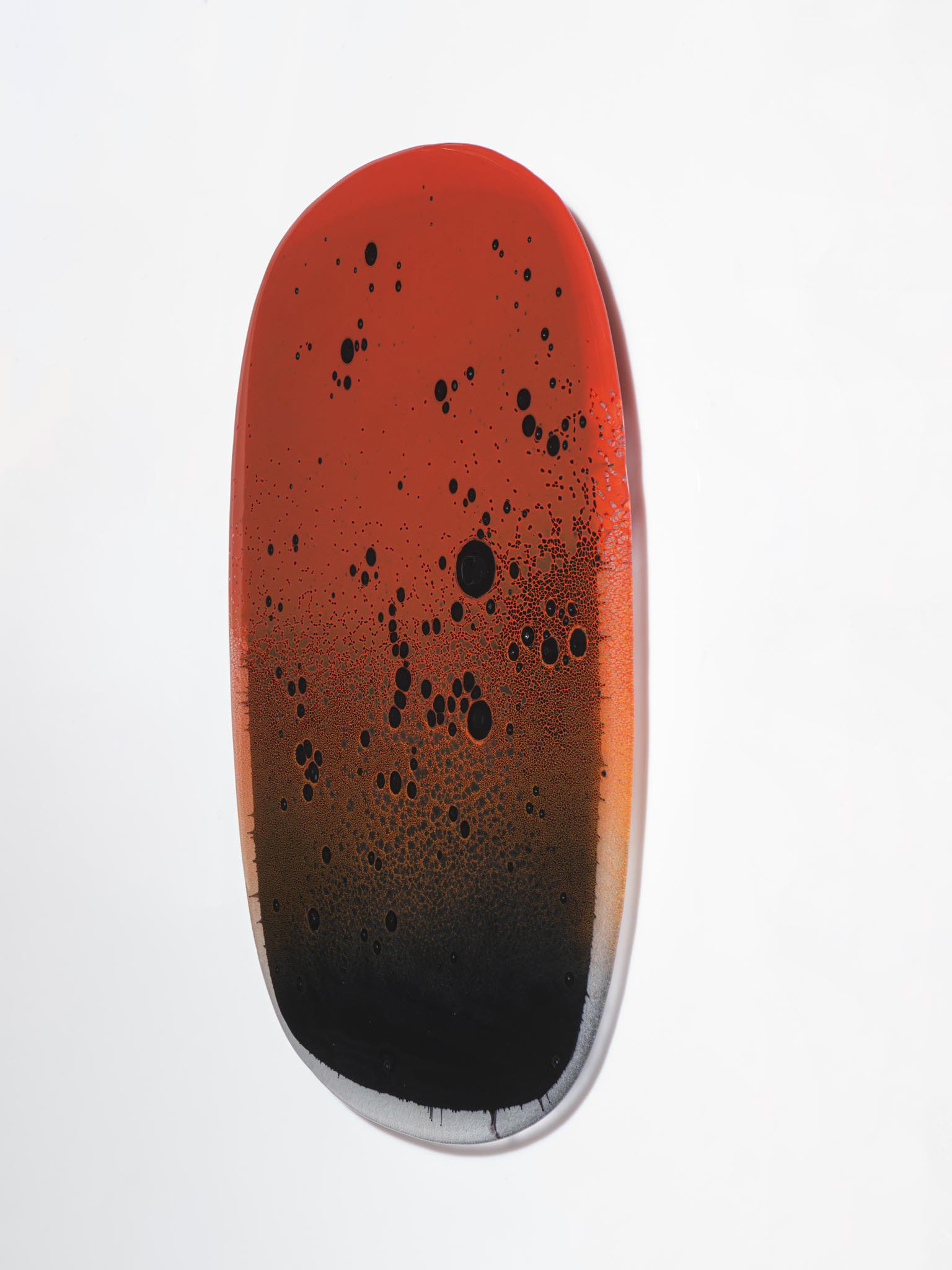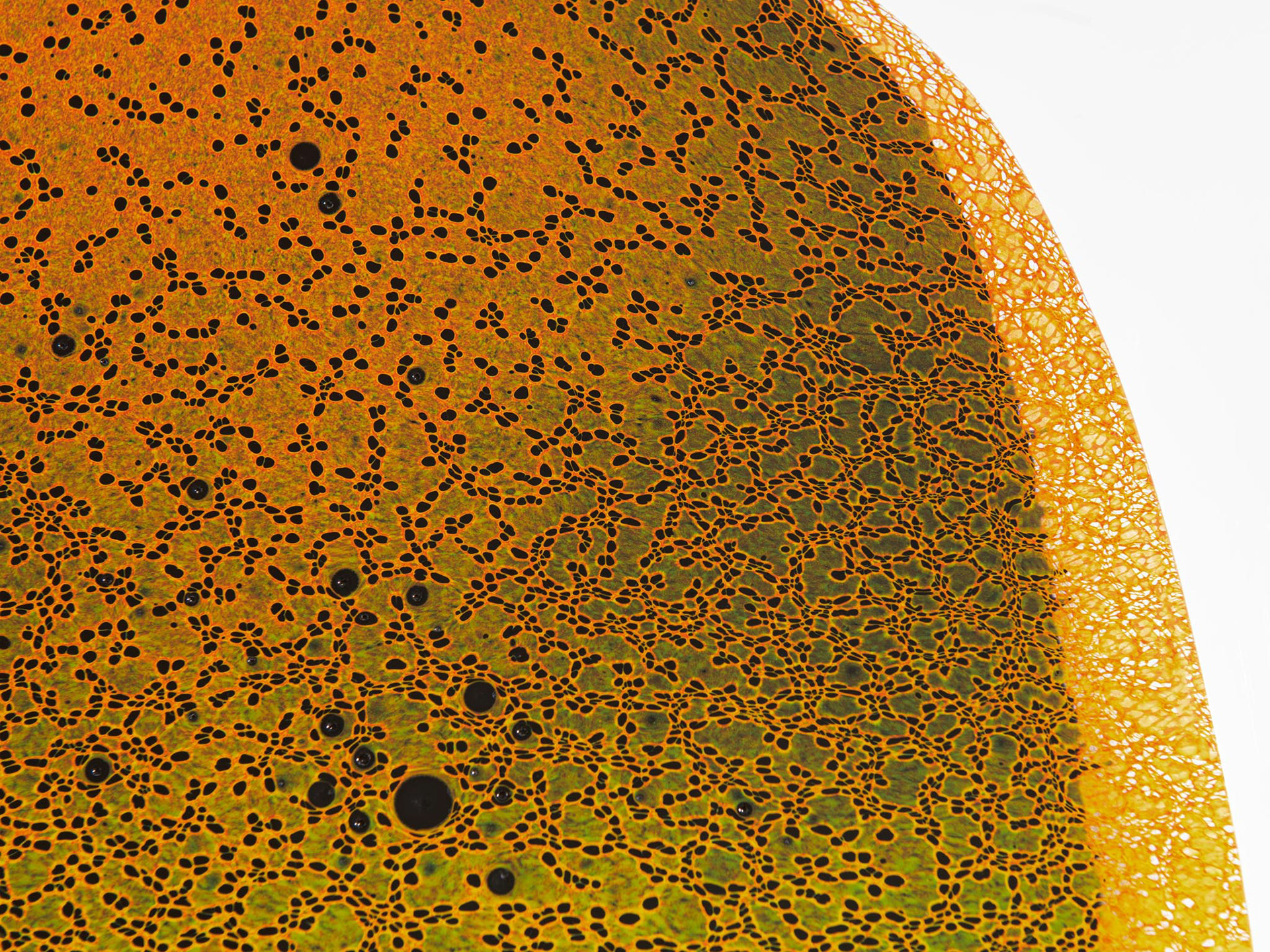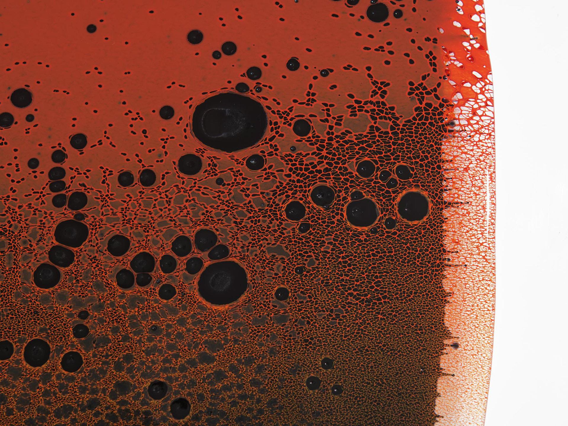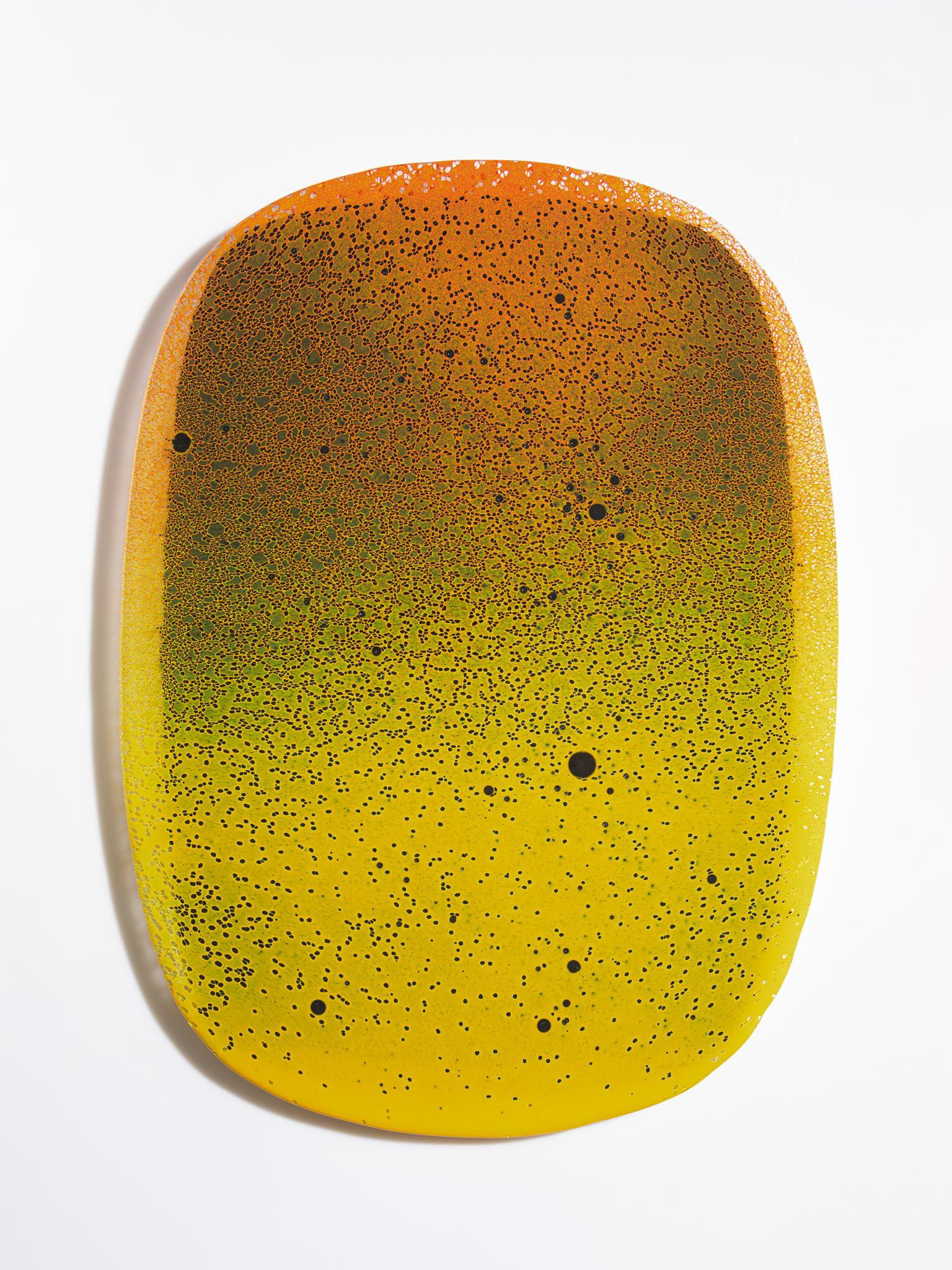 Fervere, qui vient du latin “faire bouillir”, reflète cette intention de révéler ce qui se joue entre les couches de verre et d’émail : migrations, diffusion de couleurs, densités qui se croisent et s’interpénètrent. Cette exploration technique me  permet de créer un langage graphique singulier fait de contrastes, de micro-détails et de nuances fondues. Les dégradés servent d’ailleurs de terrain d’expérimentation : ils témoignent du spectre des possibles à travers les variations d’épaisseurs entre émail et verre.